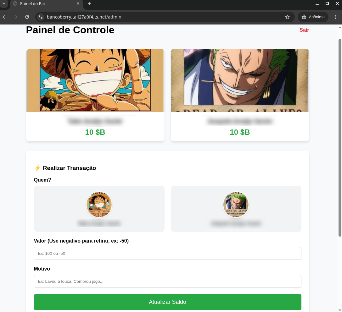 Berry é a moeda do anime One Piece, um anime que meus filhos gostam. Aproveitando isso, resolvi criar um "banco virtual" para gerenciar os Berries deles.