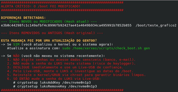 echo -e "ALERTA CRÍTICO: O /boot FOI MODIFICADO!"